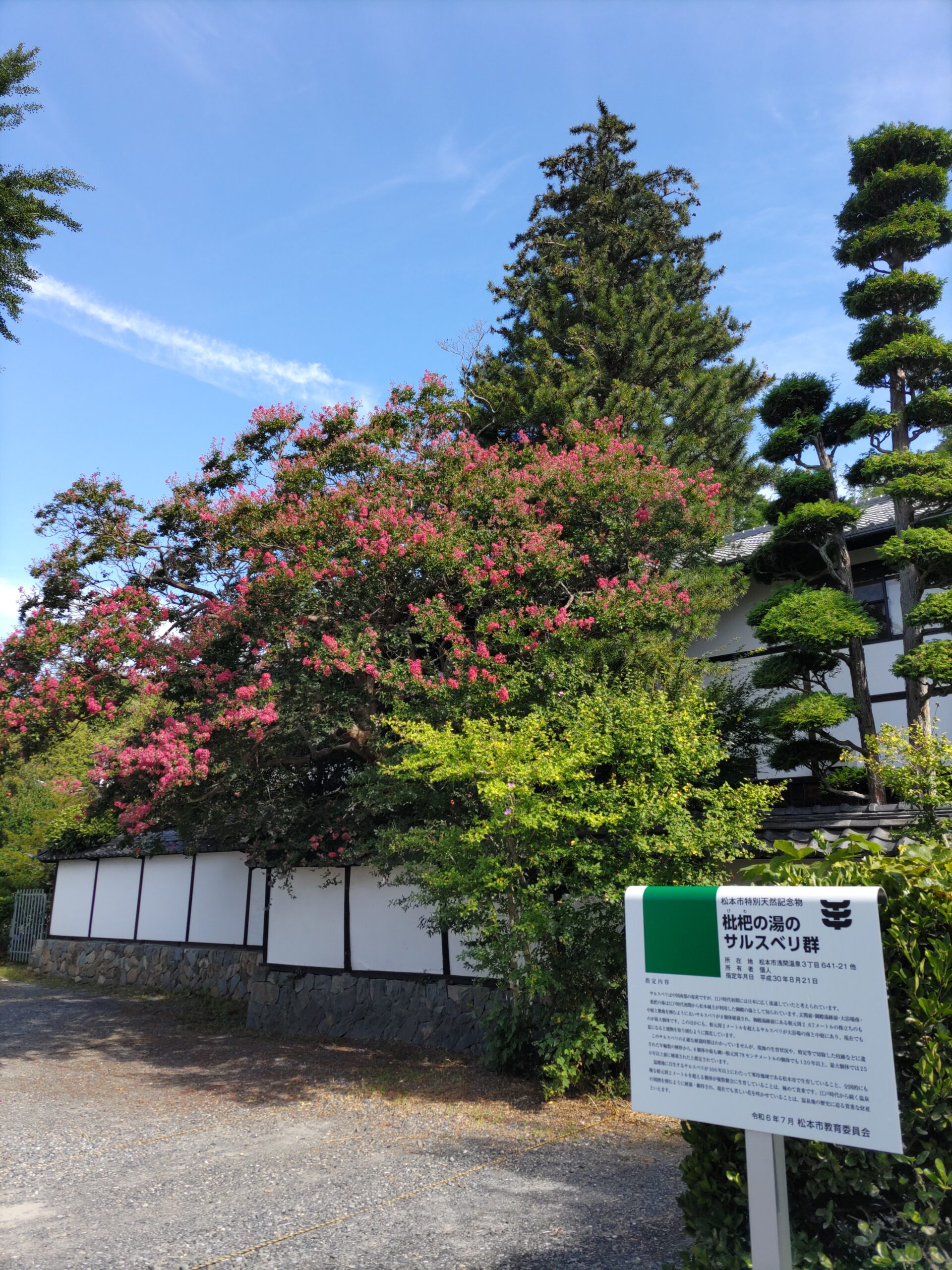松本の奥座敷、浅間温泉に『湯々庵 枇杷の湯』という日帰り温泉施設があります。初代松本城主石川氏の湯殿として、400年の歴史を持つという温泉施設ですが、なかなか雰囲気も良いので、我が家も県外のお客さんが来た時などには、結構利用させていただいております。ここに樹齢300年以上と云われる立派なサルスベリがあり、露天風呂からも間近に赤、白、ピンクの花が見られるので、より重厚な雰囲気を醸し出しているように思います。ちょっと時間に余裕がある時などには、昼間からゆっくり温泉に浸かりながら、物思いにふけるというのも、ちょっとした旅行気分も味わえて、なかなか贅沢な時間と空間を得られるように思います。 【管理人 堤】